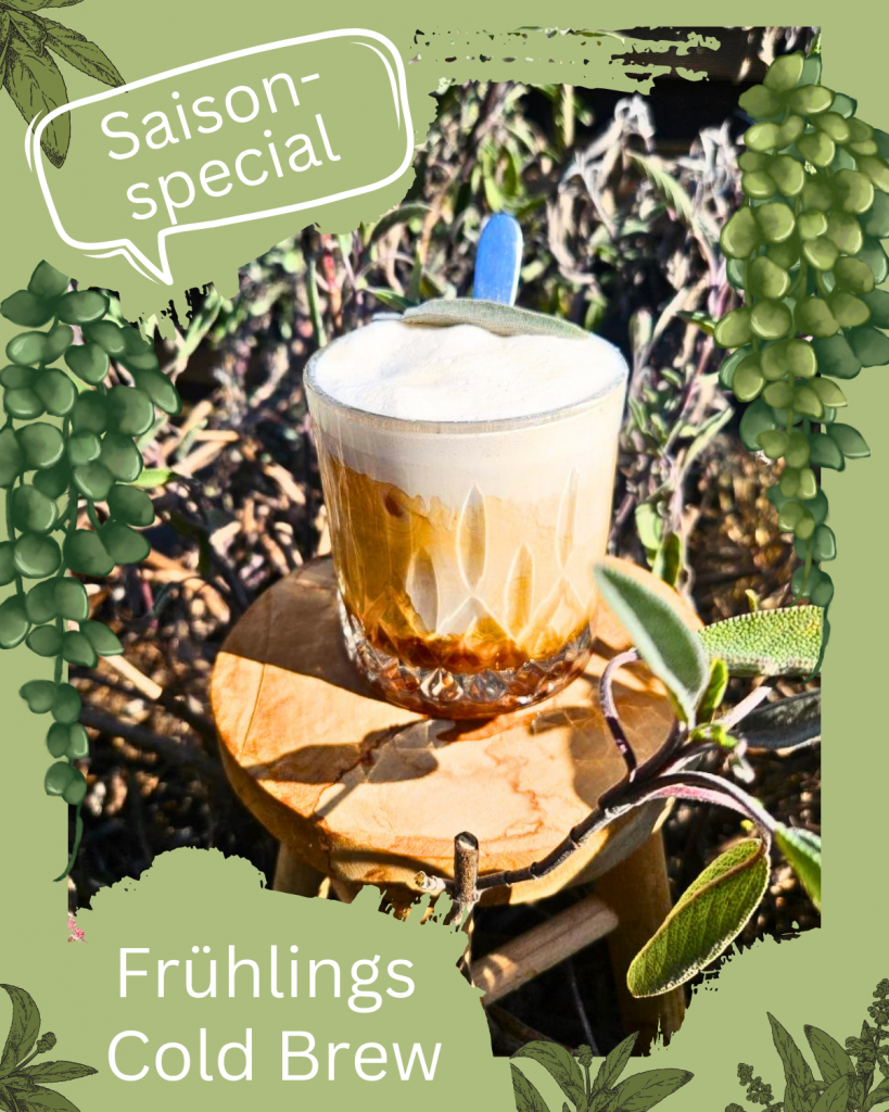 Unser sanfter Cold Brew kommt schon vor dem Sommer zurück, als Frühlingscolbrew mit Salbei. Auf Eis und mit Agavensirup, der mit Salbei aus dem eigenen Garten infused wurde, passt er perfekt zu den ersten Sonnensrahlen. Richtig vollmundig wird er durch den samtigen vanilla Cold Foam.