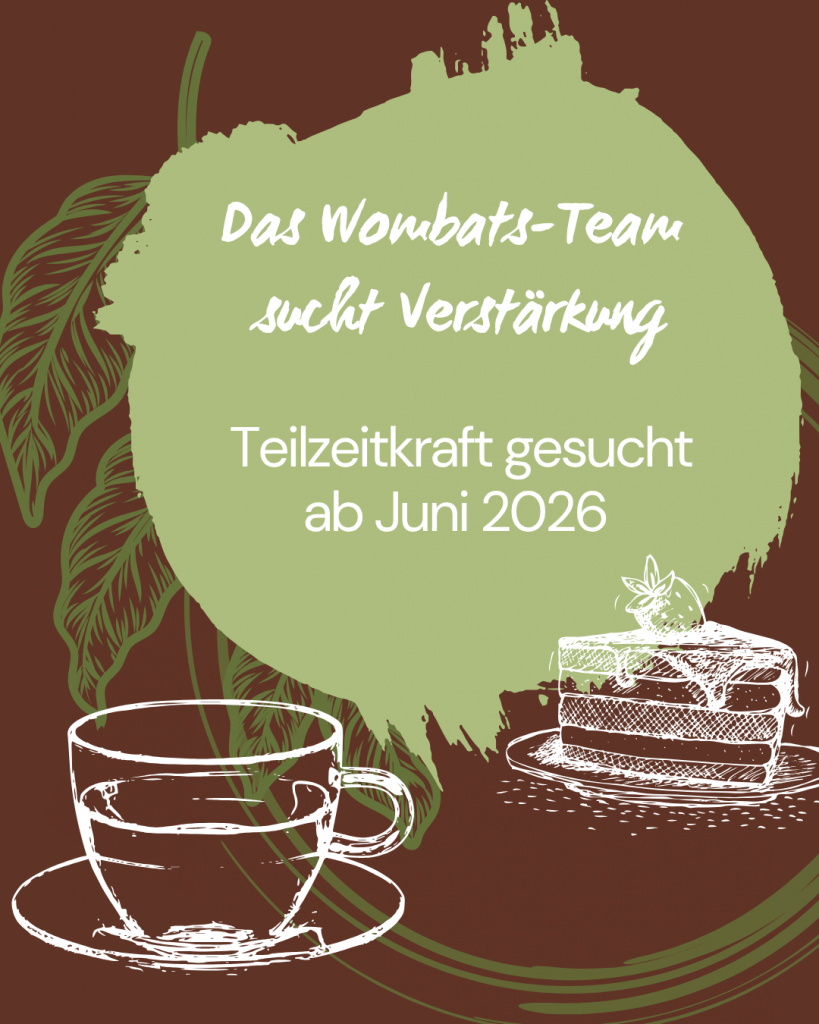 Wenn du Lust hast, Teil eines kleinen Herzensprojekts zu werden und das Café aktiv mitzugestalten, freue ich mich sehr auf deine Bewerbung!Sende deiner Bewerbung bitte bis zum 30.04.2026 an kontakt@wombatscafe.de